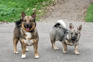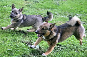Paul gooit een aantal keer de bal voor Kari. De eerste keer rent Ronja mee, waarvoor ze heftig afgesnauwd wordt. De tweede keer besluit ze dat ze mijn aanbod voor lekkers toch maar aanneemt. Als we doorlopen, halen de Spetsen weer allerlei capriolen uit, vooral Ronja. Op een gegeven moment heeft ze weer aardig de kolder in de kop, waar Kari het slachtoffer van is. Maar met wat ontwijkmanoeuvres en een enkel snauwtje weet hij haar af te troeven. Toch blijft ze heerlijk lol houden in het rondhuppelen door de afgevallen bladeren.