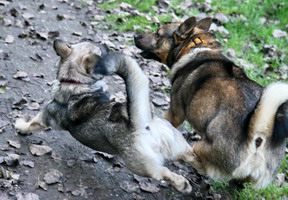 Met wandelen ga ik met de twee Spetsen op pad met een plan. Voordat ik dat kan uitvoeren, komen we een Pyrenese Berghond-pup van 4 maanden tegen - nu al maatje Joschka. Op 4 meter al begint Ronja te kronkelen. De pup stond al vol zelfvertrouwen, en dat groeit door Ronja's gedrag alleen maar. Na de kennismaking krijgt Ronja, die losloopt, de kolder in de kop en rent razendsnel rondjes om de Pyreneeër. Zijn eigenaar en ik moeten er hartelijk om lachen. Toch heeft ze geen behoefte om nog te spelen, ze houdt afstand tussen haarzelf en de andere pup, of ze danst druk voor hem op en neer. Als ik doorloop, aarzelt ze geen moment om met me mee te lopen. Kari heeft het grote witte ding al die tijd genegeerd.